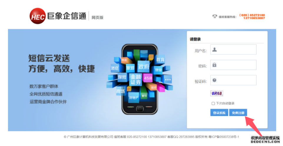 用電腦或手機登錄短信平臺軟件首頁https://sms.hechina.cn點擊免費注冊 ,如下圖所示。用戶名可以是手機號碼、公司簡稱的中文或拼音。