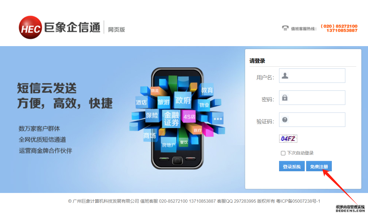用電腦或手機登錄短信平臺軟件首頁https://sms.hechina.cn點擊免費注冊 ,如下圖所示。用戶名可以是手機號碼、公司簡稱的中文或拼音。
