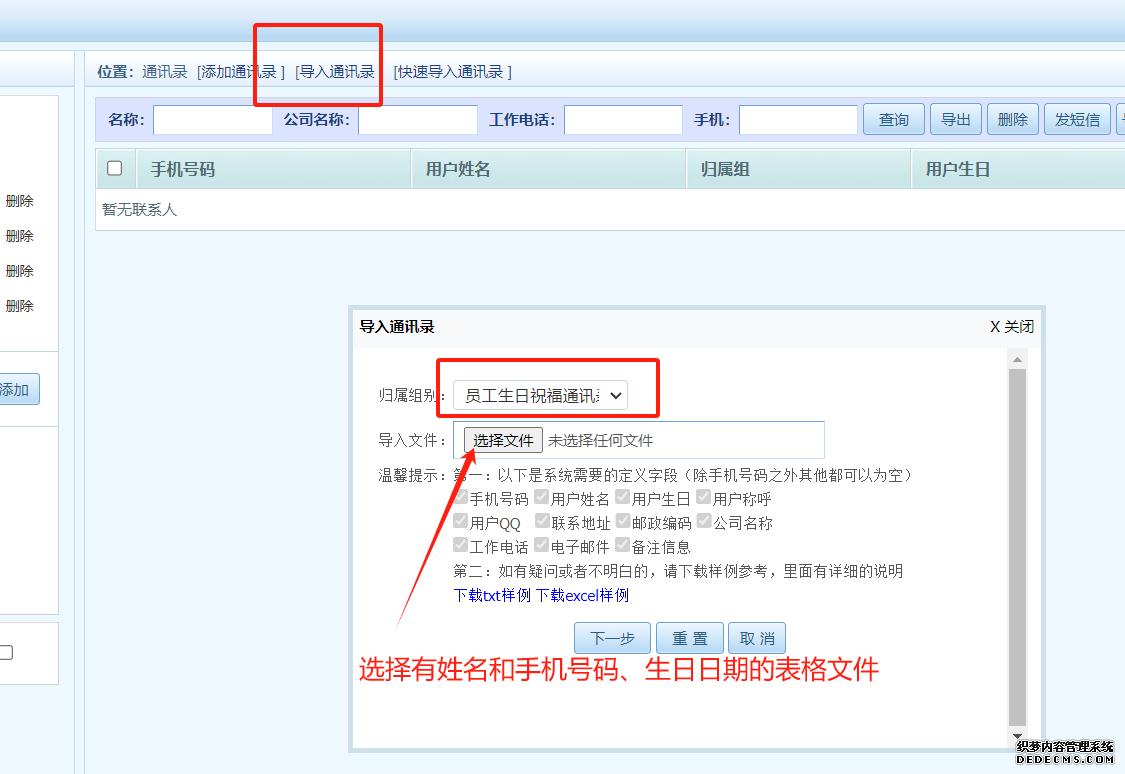 第四步、把有手機號碼、姓名和生日日期的表格文件導(dǎo)入到第三步所建立的生日通訊錄組,操作如下圖所示