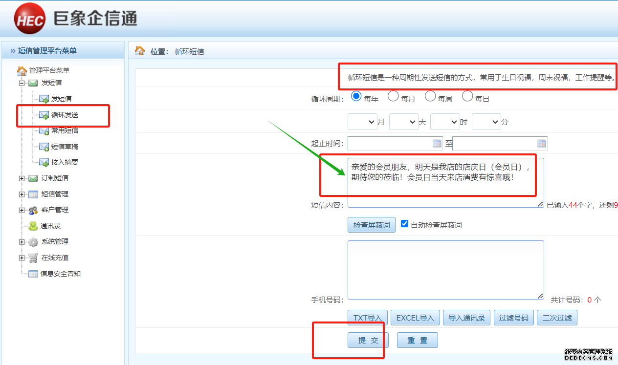 第六步、其他周期性(如工作提醒、會員日提醒等等)需要自動定時循環(huán)發(fā)送短信的設(shè)置方法如下圖所示
