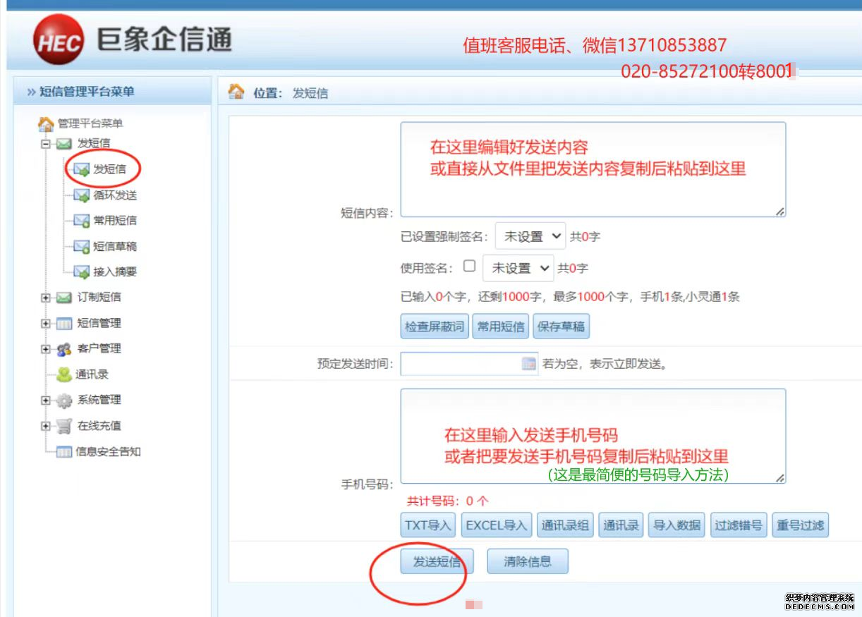 短信內容和發送對象號碼都可以從您的文檔或表格中復制后直接粘貼到平臺界面上“發短信”欄目的相應框格中(號碼粘貼上去后系統會自動整理),如下圖所示。